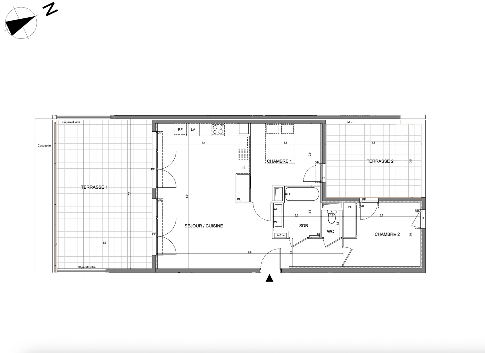 Son agencement offre une pièce de vie avec cuisine de plus de 37m2 ouvrant sur large terrasse de 32m2, 2 chambres avec placard donnant sur une seconde terrasse de 16m2, salle de bains et WC.
